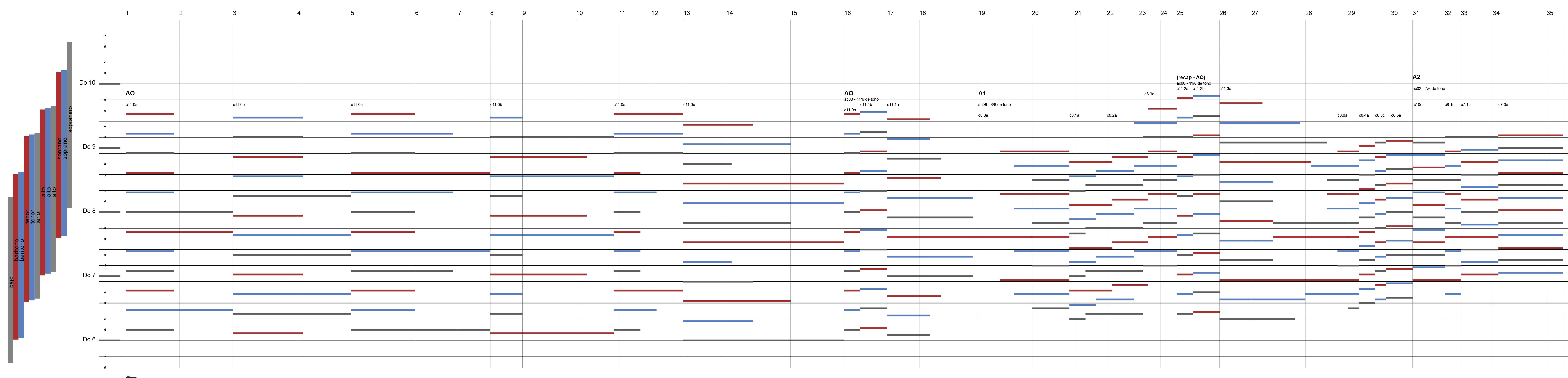 El uso de tres cuartetos con afinaciones diferentes impone ciertas restricciones en la escritura, además de las propias de la tesitura de cada instrumento. Para visualizar con claridad las posibilidades de realización de las diferentes armonías se utilizó una partitura reticular al estilo del piano roll MIDI. En el lateral de la partitura se cuenta con una ayuda gráfica para manejar las tesituras de cada instrumento del ensemble.